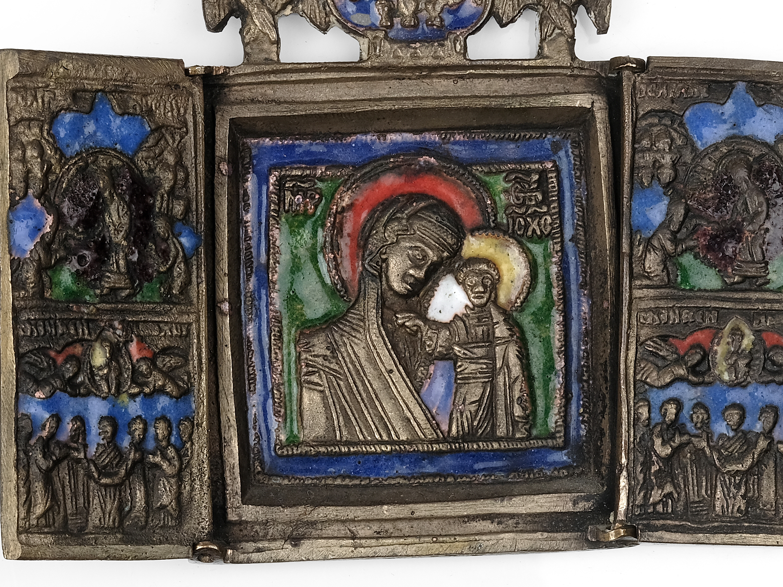 Bronze, emailliert in Blau, Gelb & Rot