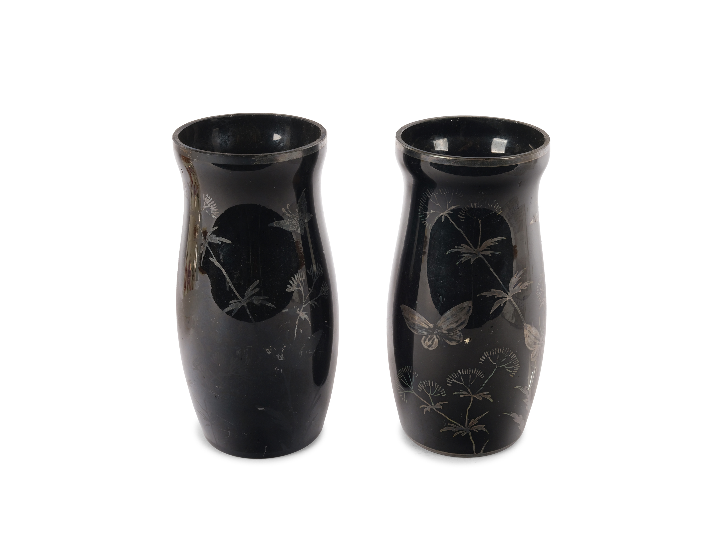 Pair of vases made of dark purple glass, painted with floral motifs