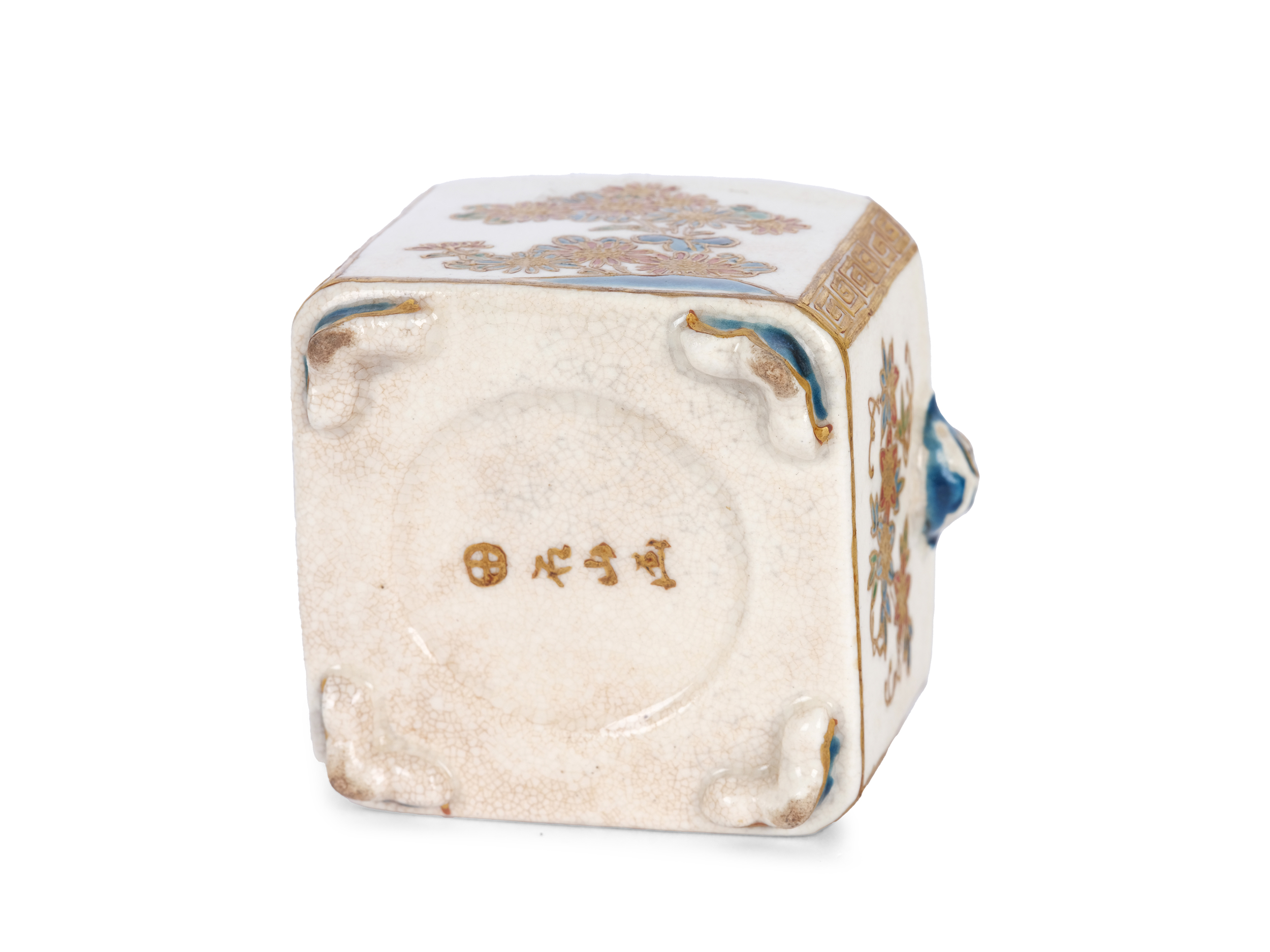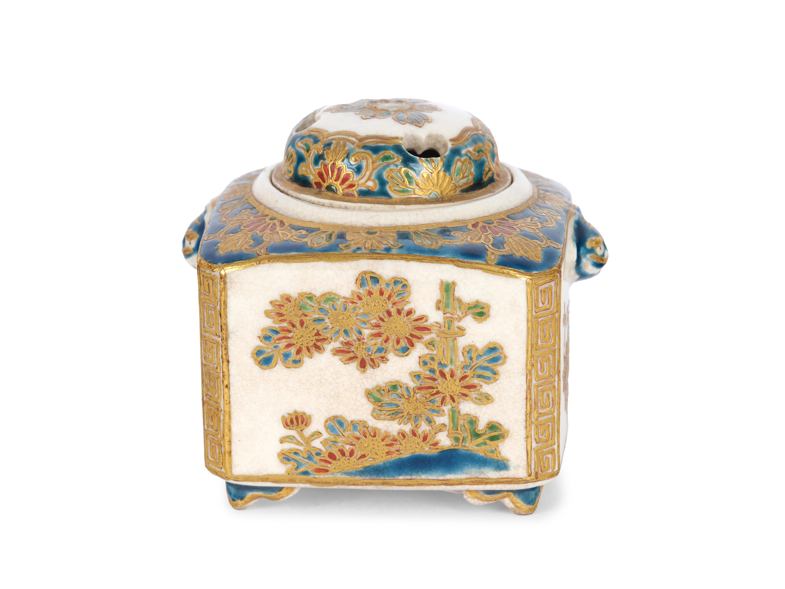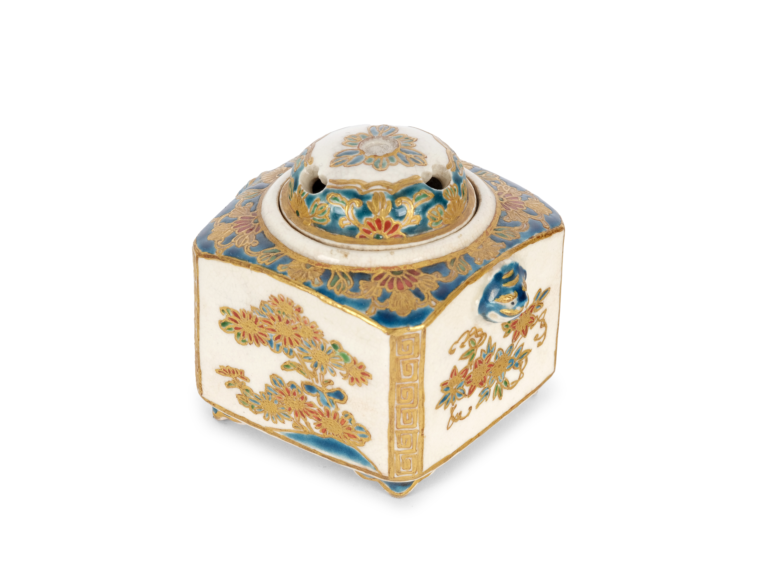 Small square koro (incense burner) with round lid and sparse floral and geometric decorations. Two protomes in the form of shishi heads.