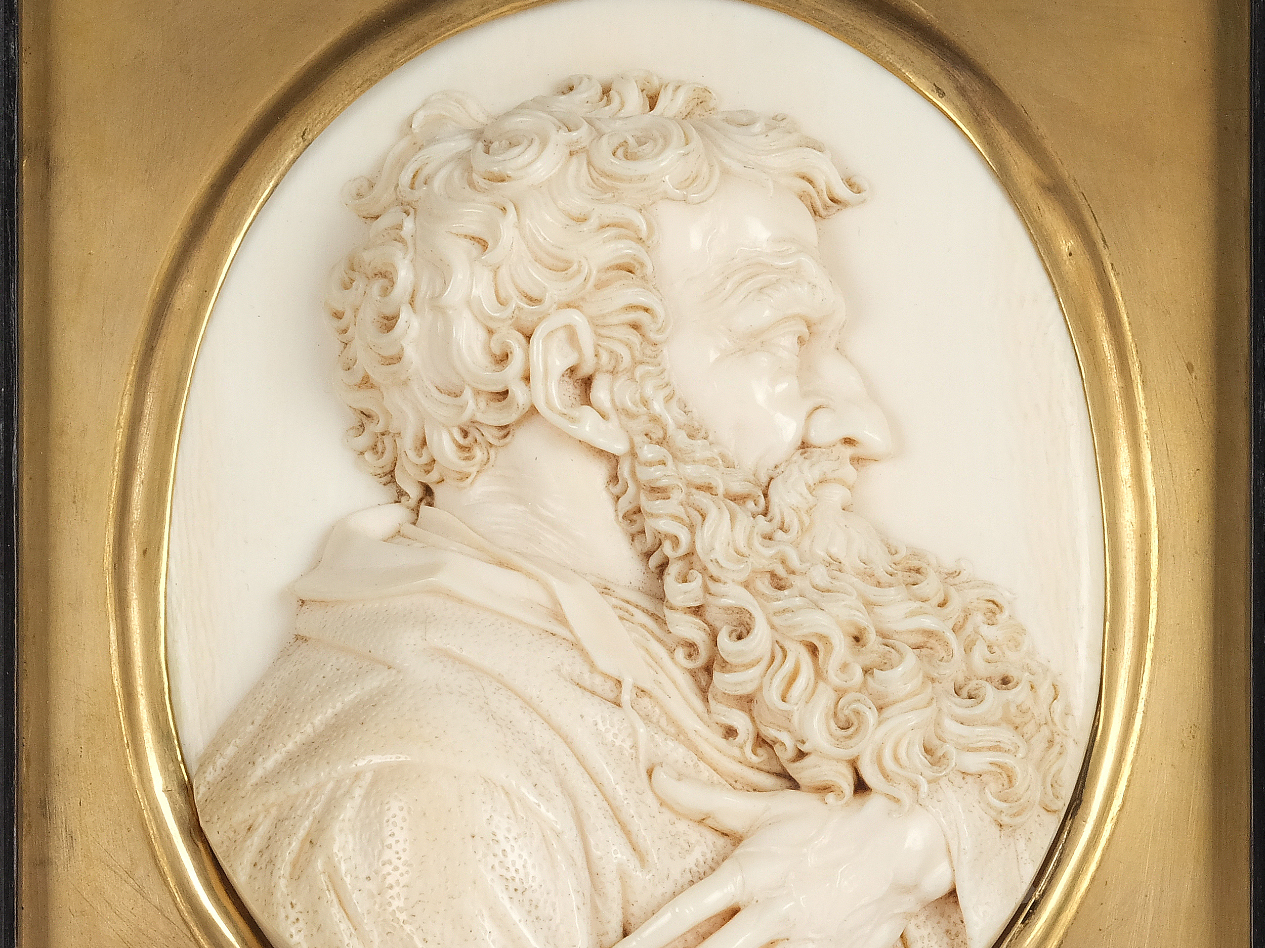 Dieses Brustbildrelief ist ein bemerkenswertes Beispiel für Poschs meisterliche Handwerkskunst und verdeutlicht seine Fähigkeit, in einem kleinen, ovalen Format sowohl Emotion als auch Charakterzüge einzufangen. Es handelt sich nicht nur um ein außergewöhnliches Kunstwerk, sondern auch um ein bedeutendes Zeugnis der Elfenbeinbildnerei. Die Verbindung von Poschs Virtuosität und dem hochwertigen Material macht dieses Relief zu einem herausragenden Sammlerstück für Liebhaber der Kunst des 18. und 19. Jahrhunderts.