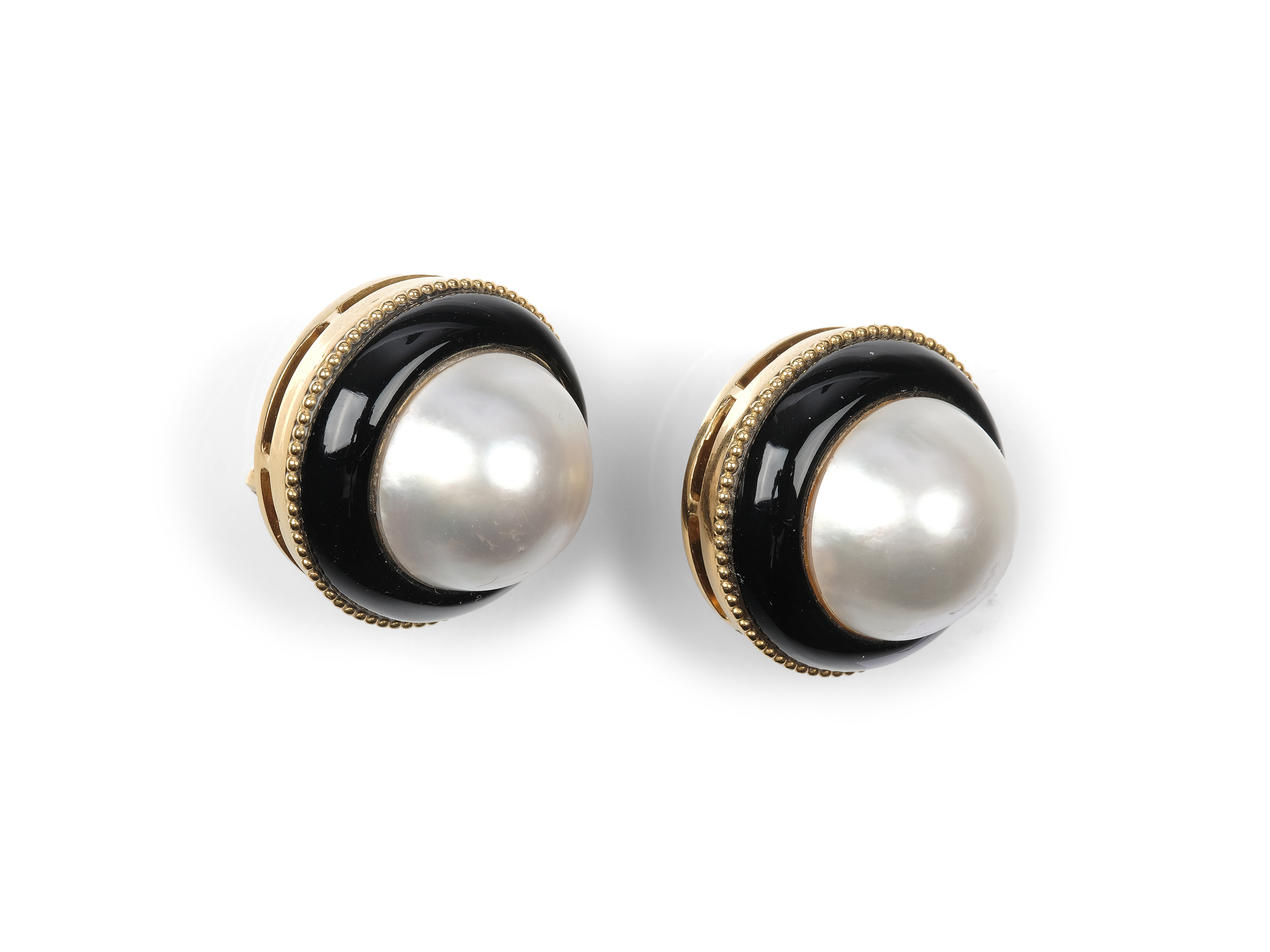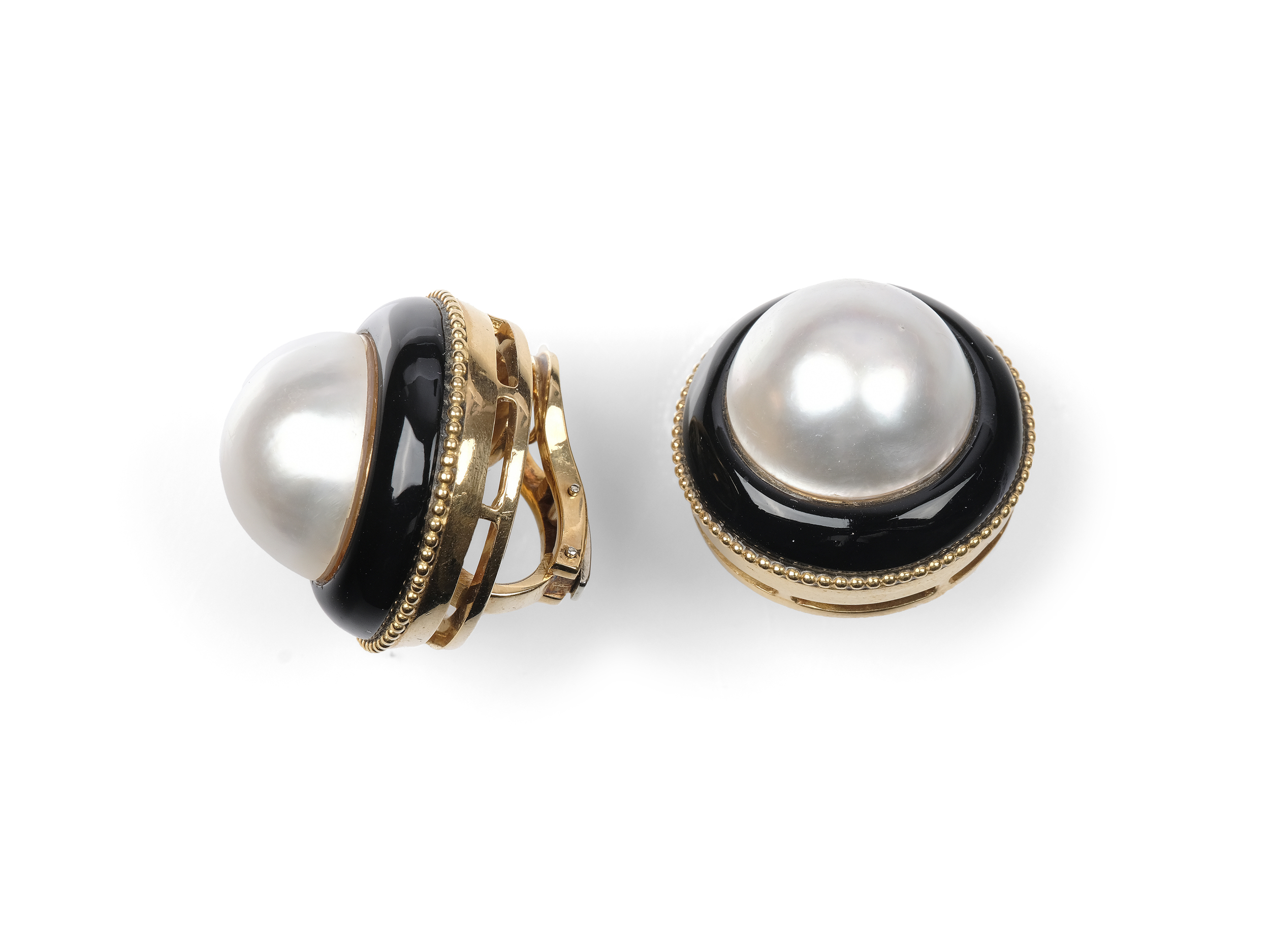 Geziert mit je einer Tahitiperle, Onyx und einem Perlrand