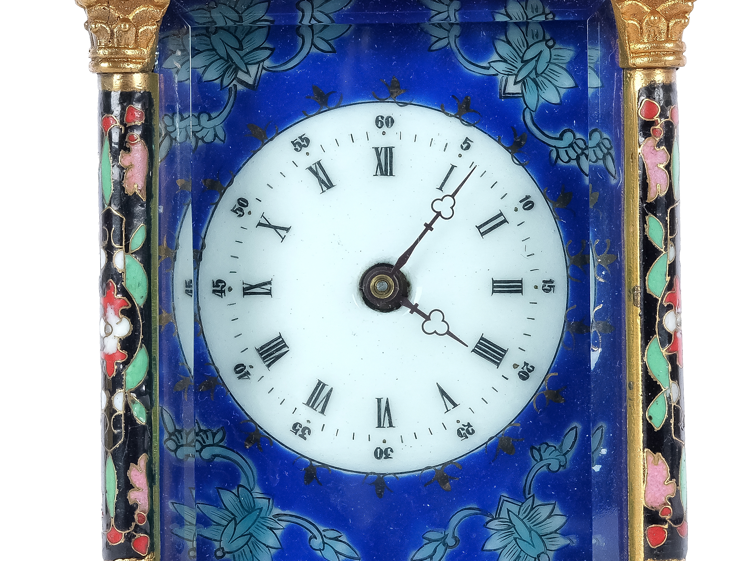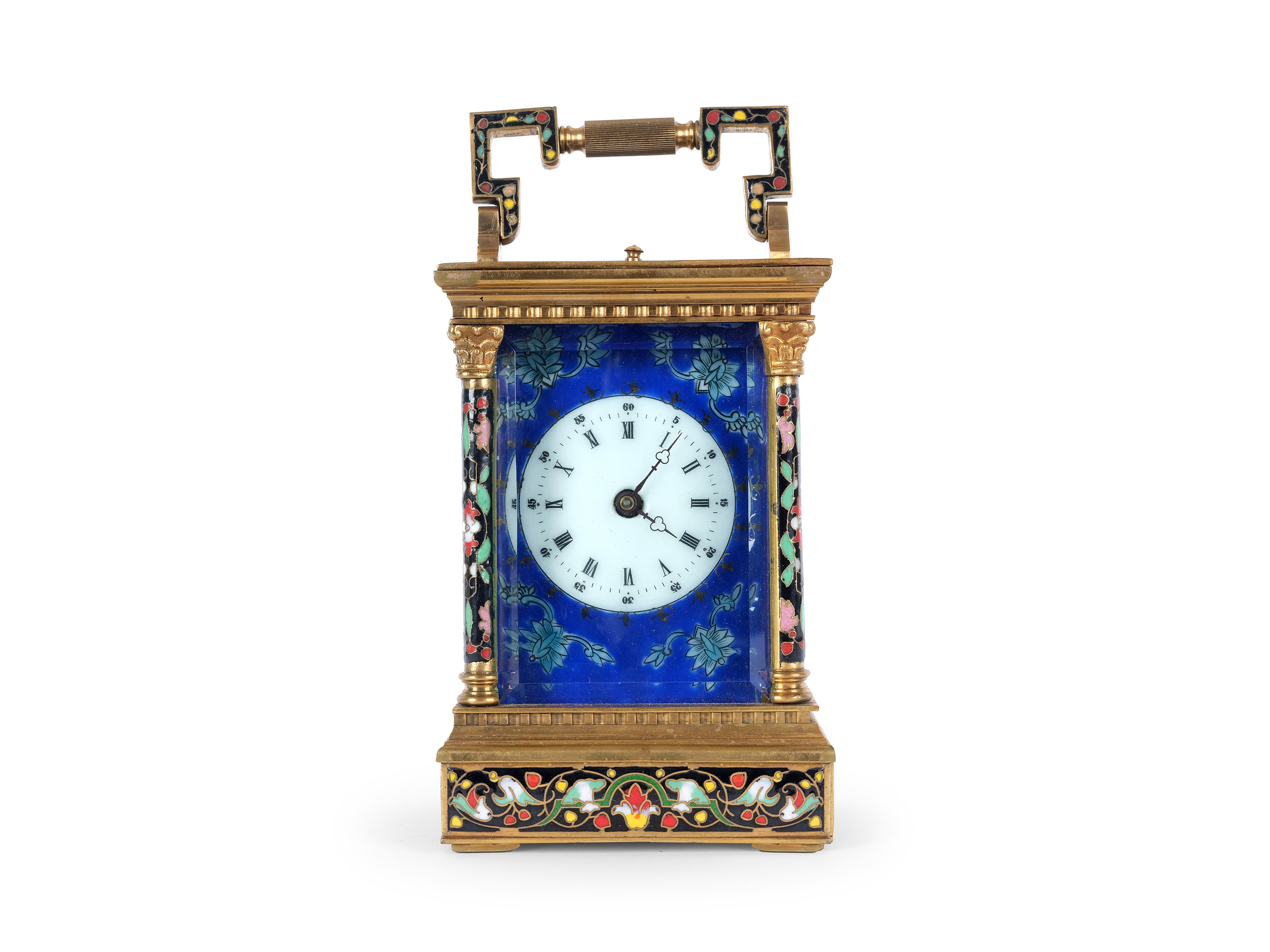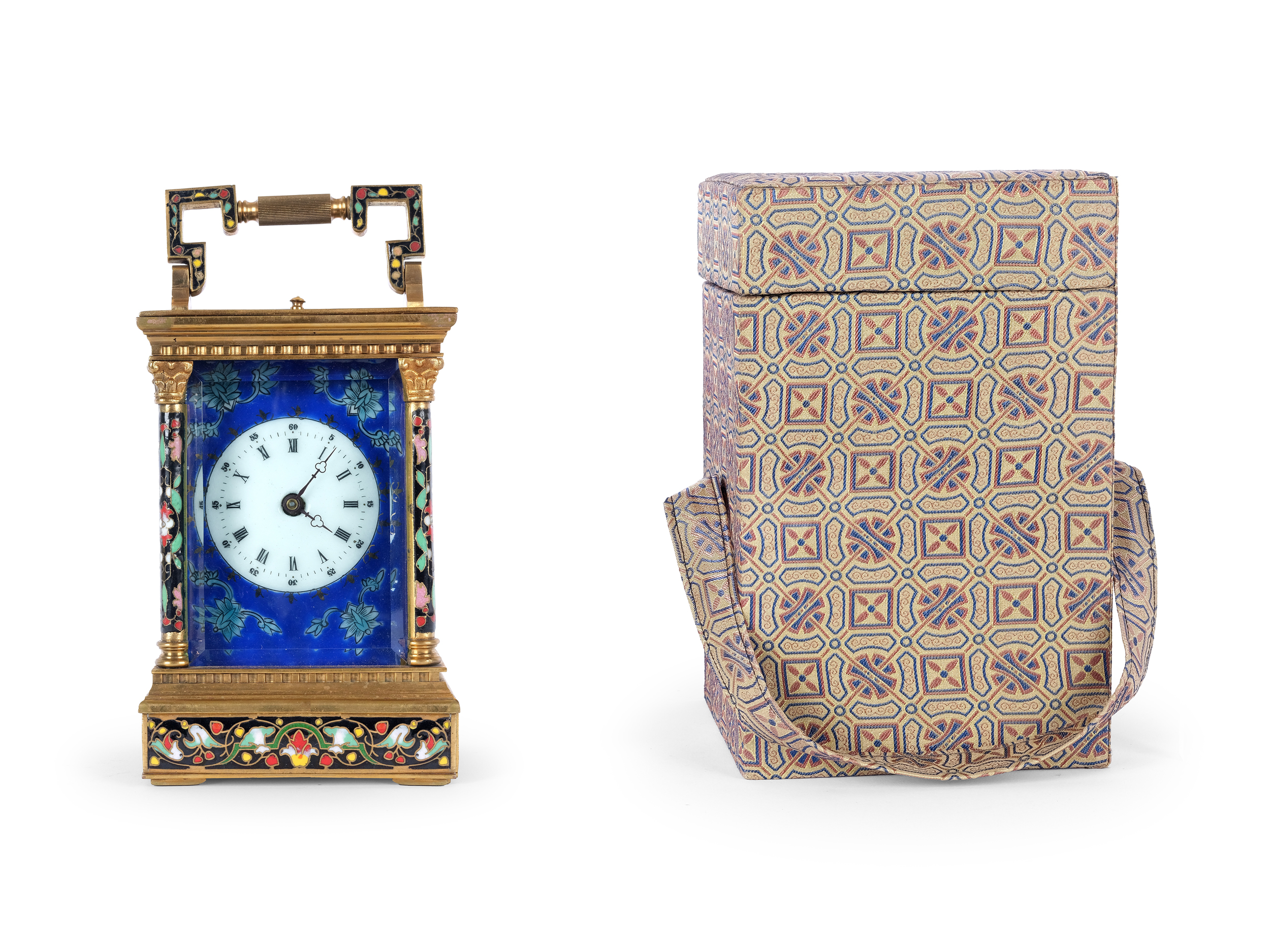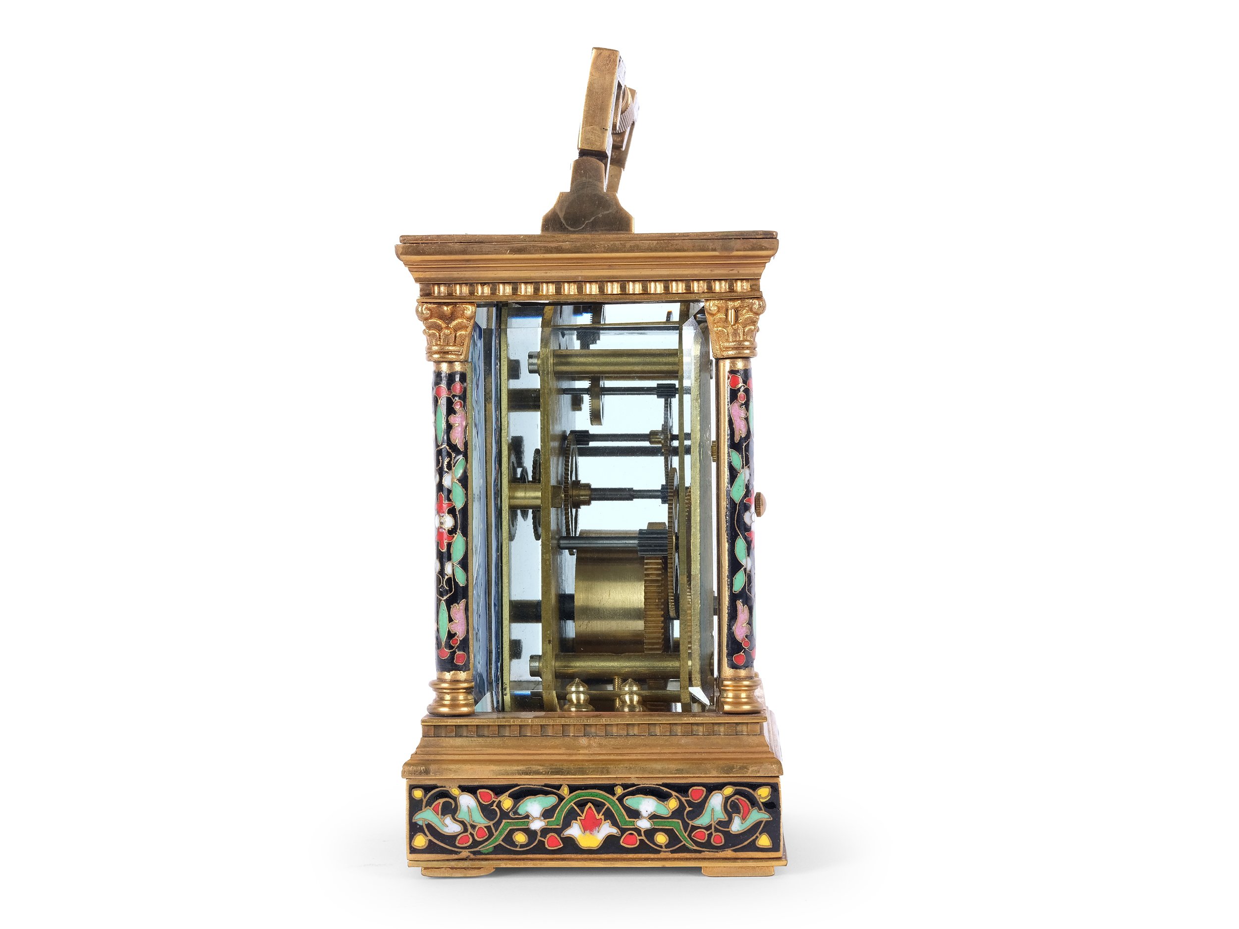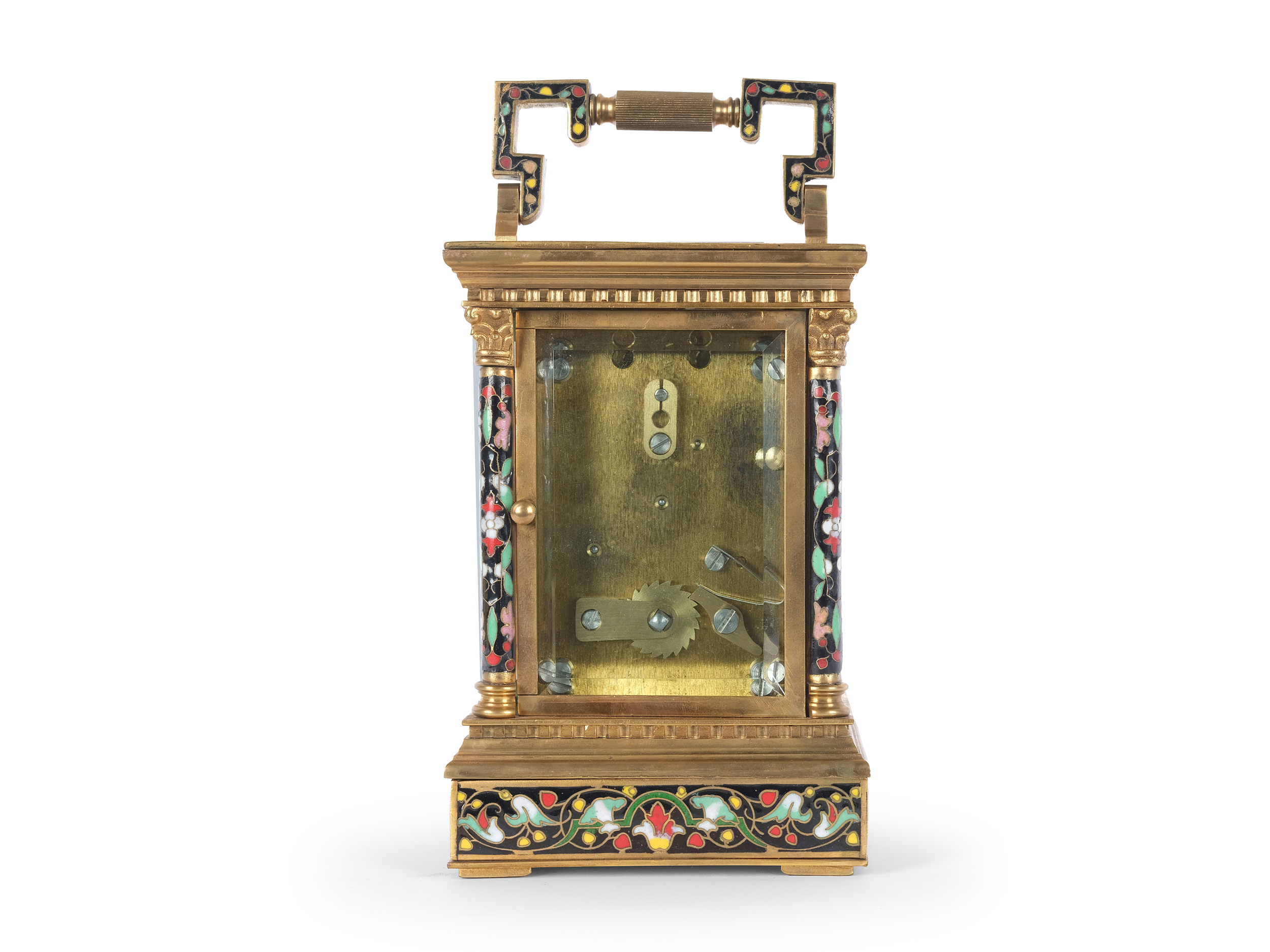 Gehäuse und Tragbügel aus poliertem Messing, teilweise verziert mit feinstem polychromen Cloisonné-Emaille