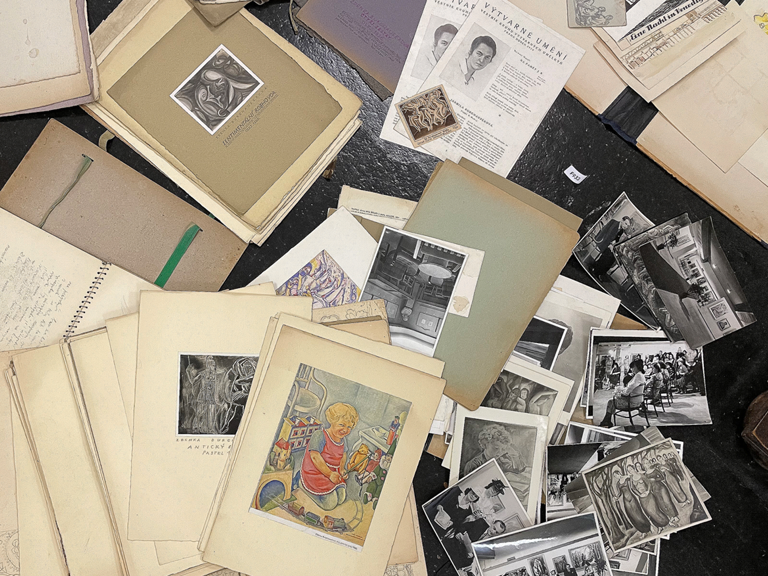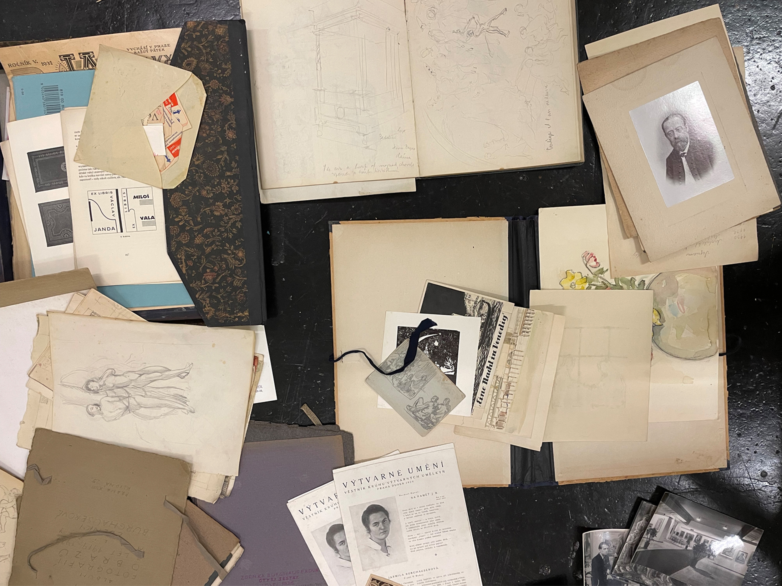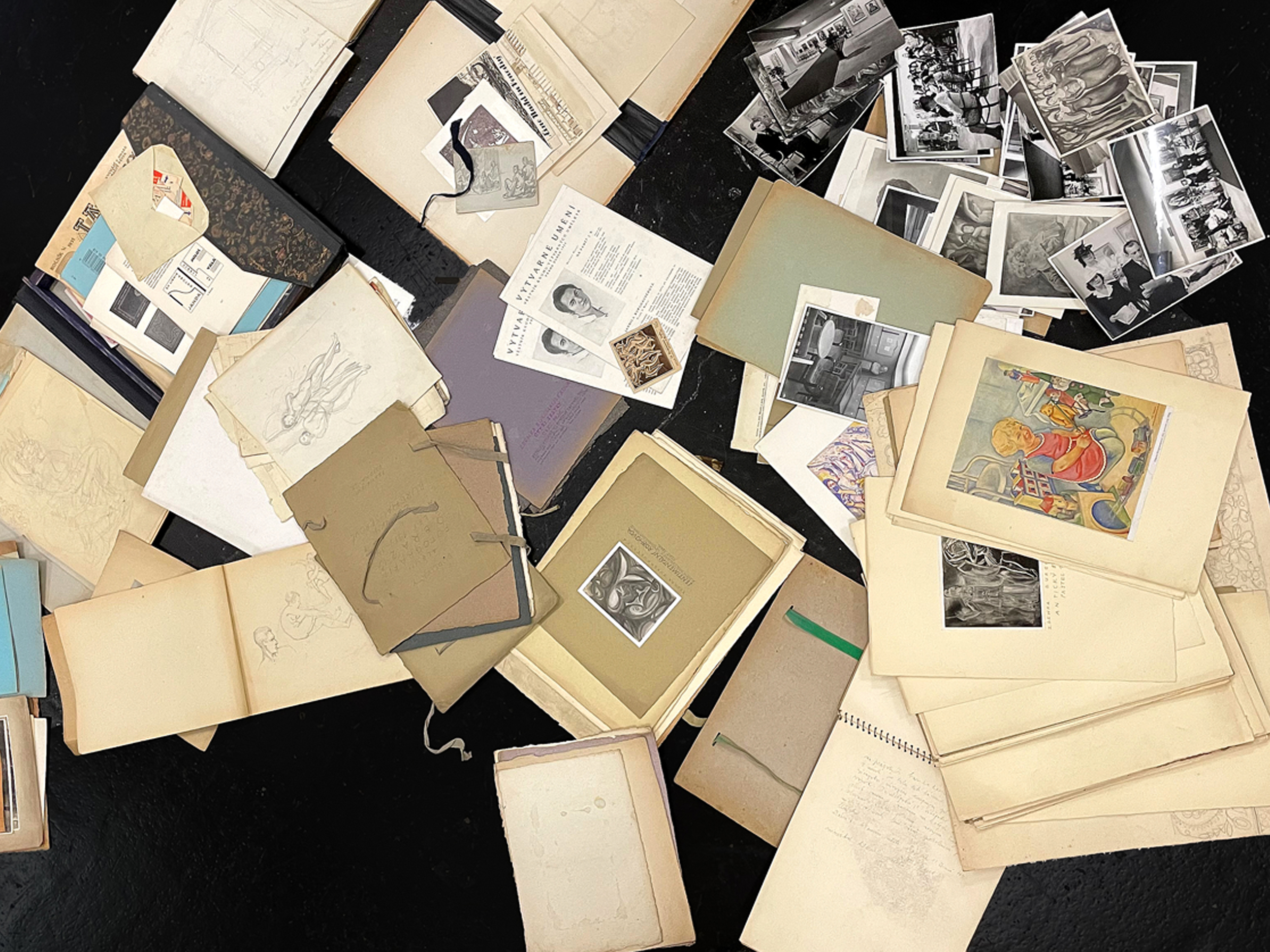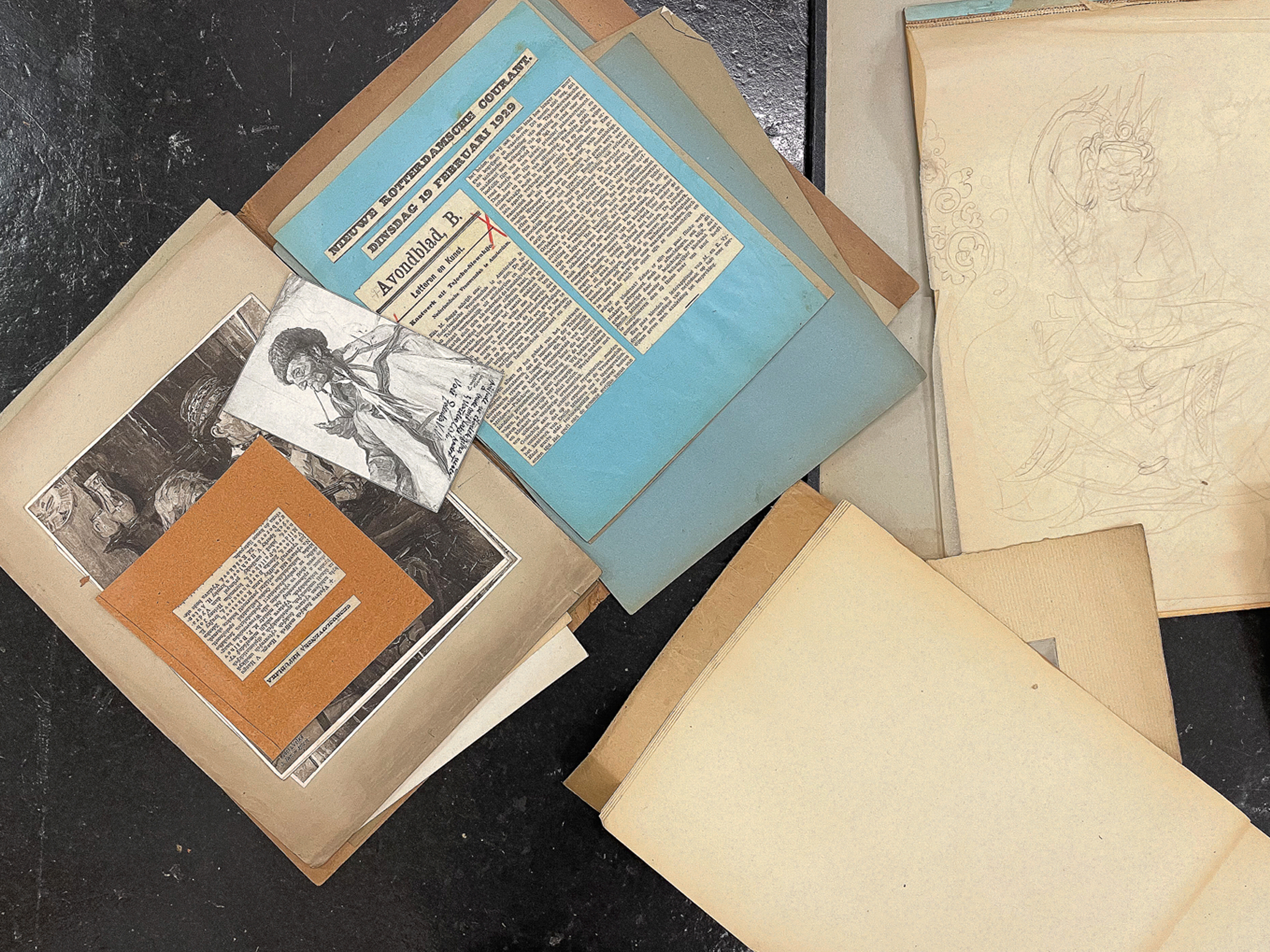 Konvolut von Skizzen, Fotos und Zeitungsausschnitten